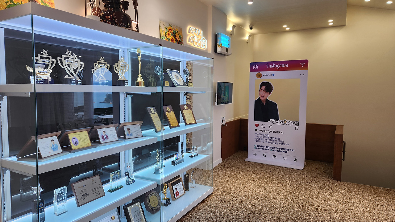 가게 안에는 그의 여러 상과 트로피가 전시되어 있어요. 팬들에게 사랑을 받는 가수가 되기까지의 여정을 보여주는 것 같아 감동적이에요. 다양한 상과 인증서들이 가득한 전시 공간은 박서진의 열정과 노력의 결과를 나타내고 있어요.