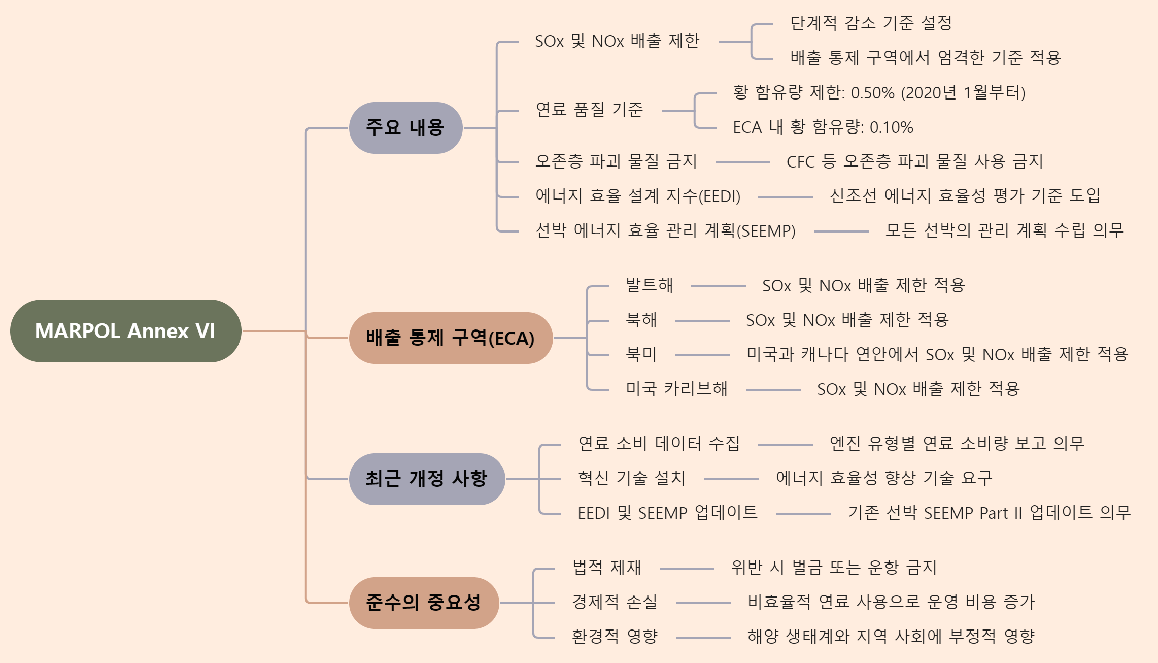 MARPOL Annex VI는 국제해사기구(IMO)가 제정한 해양 오염 방지 협약의 일부로, 선박에서 발생하는 대기 오염을 줄이기 위한 규제를 다룹니다. 1997년에 처음 채택되어 2005년 5월 19일 발효된 이 규정은 선박 배기가스에 포함된 주요 대기 오염 물질인 황산화물(SOx), 질소산화물(NOx), 입자상 물질(PM), 그리고 오존층 파괴 물질(ODS)의 배출을 제한합니다. 또한, 선박 연료 품질, 에너지 효율성, 그리고 특정 배출 통제 구역(ECA) 내에서의 엄격한 기준을 포함하여 전 세계적으로 해양 환경 보호를 강화하는 데 중요한 역할을 하고 있습니다.