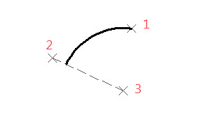 반시계방향 또는 시계방향으로 모든 호는 시작점(1)에서 끝점(2)까지 생성할 수 있으며, 시작점에서의 접선 방향은 지정된 세 번째 점(3)에 의해 정의됩니다.